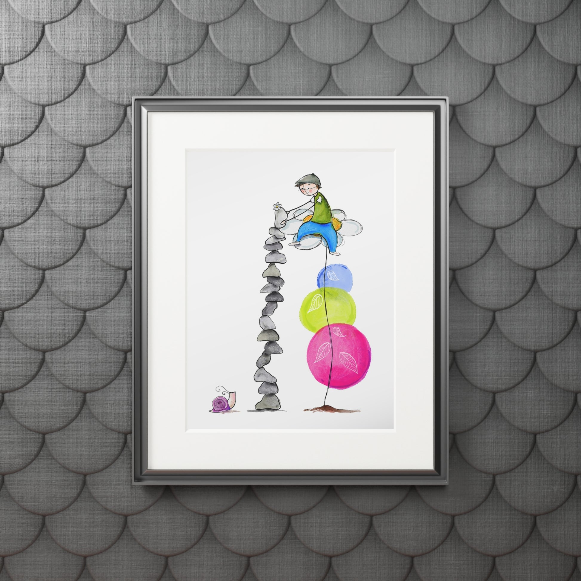 A bright, playful fine art print presented with a clean passepartout mount that lets the artwork breathe. The giclée reproduction captures lively, saturated colors and delicate linework on textured 175gsm fine art paper. The thick 2mm natural-white window mount frames the image with a crisp border, giving gallery-style presence without a bulky frame. Shipped flat and ready for easy assembly into your own frame — this piece adds a light, whimsical touch to a child’s nook, a studio wall, or a cheerful gallery cluster.