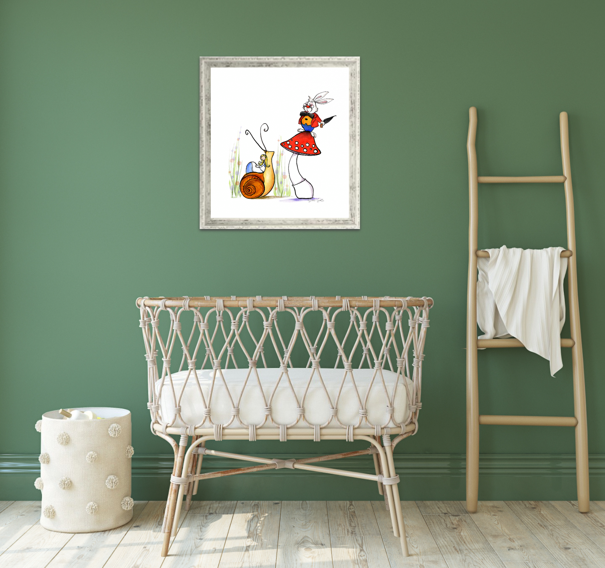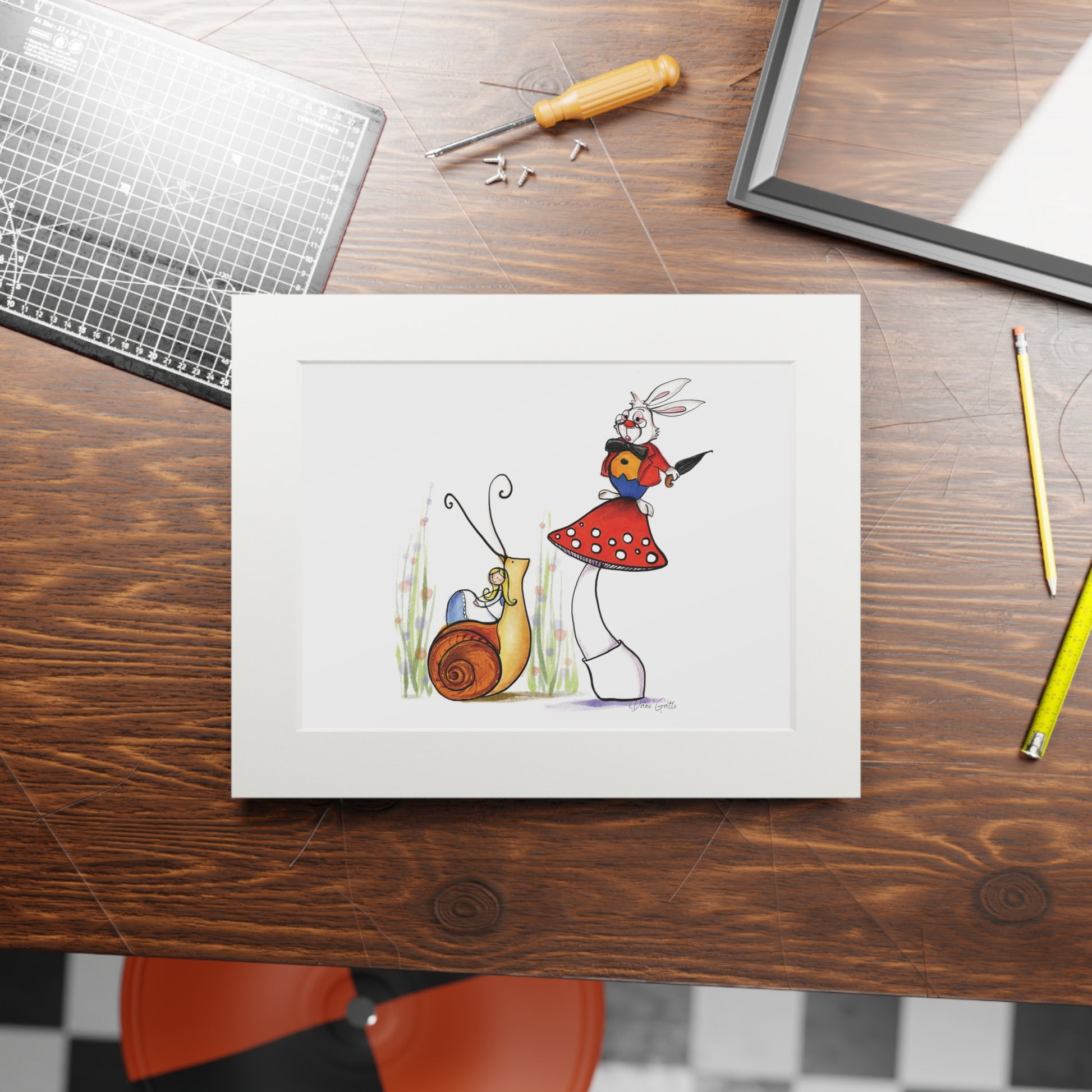 A whimsical fine art print presented with a clean passepartout window that draws the eye to the artwork. Bright, archival giclée inks bring vivid color and crisp detail to the illustration — the little rabbit perched on a spotted mushroom and the friendly snail beside it feel lively and light. The natural white 2mm mountboard frame gives the piece a museum-like margin, creating depth and quiet elegance on any wall. It arrives as a premium print on textured 175gsm fine art paper; a little assembly is required to place the print into your existing protective frame. This piece adds a playful, storybook touch to nurseries, reading nooks, or rooms where imagination matters.