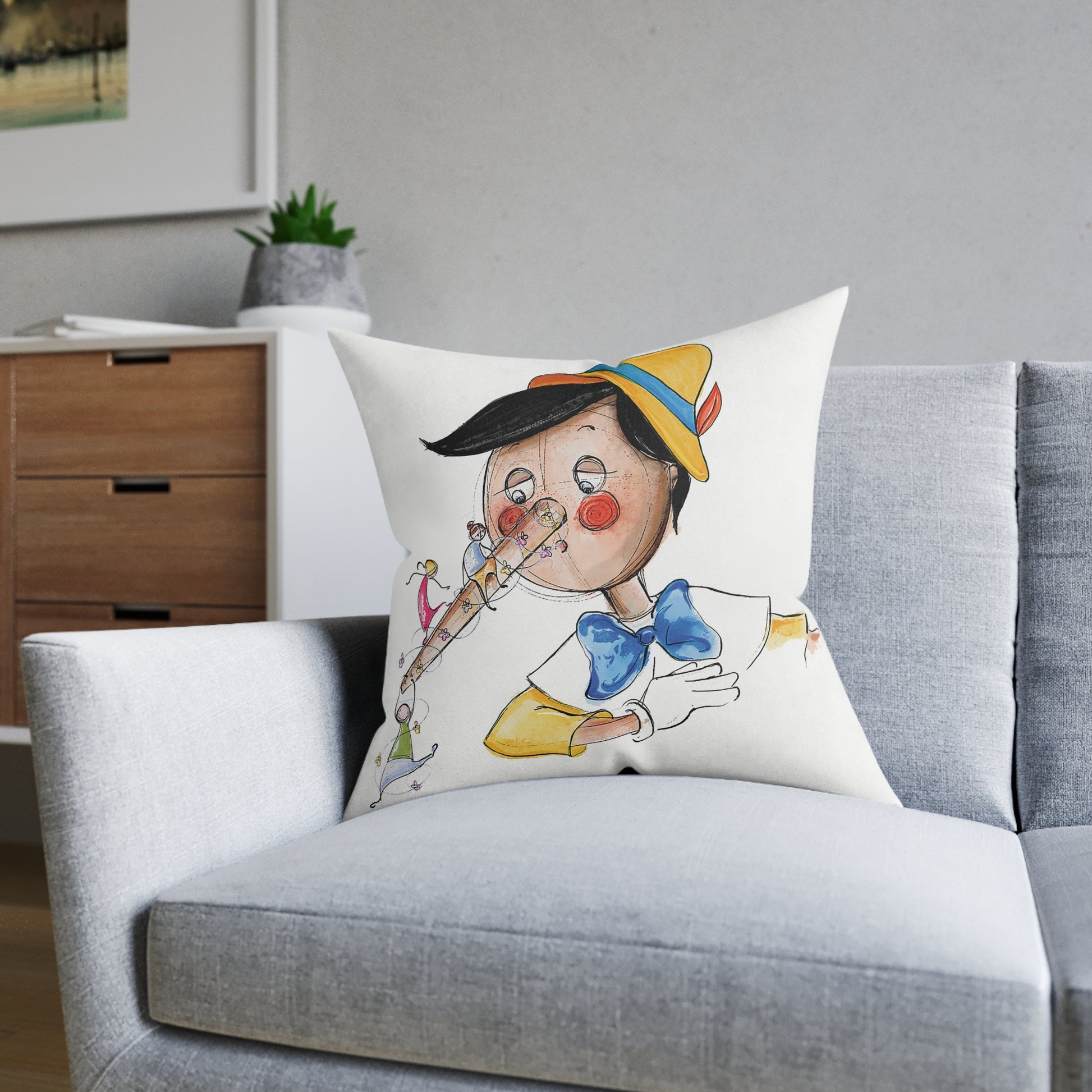 Bright, whimsical, and a little mischievous — this square pillow brings storybook charm to your sofa or reading nook. The front features a hand-drawn Pinocchio illustration rendered in lively watercolor tones, full of character and motion. The reverse is a solid, warm mustard that frames the art and adds a cozy pop of color to any room. Plush to the touch with a faux-suede feel, the pillow holds its shape while staying soft for cuddling or leaning. Small details like the concealed zipper and double-sided printing keep the look clean and polished. It slips easily into everyday life: propped on a chair, layered on a bed, or kept nearby during storytime to spark imagination and conversation.