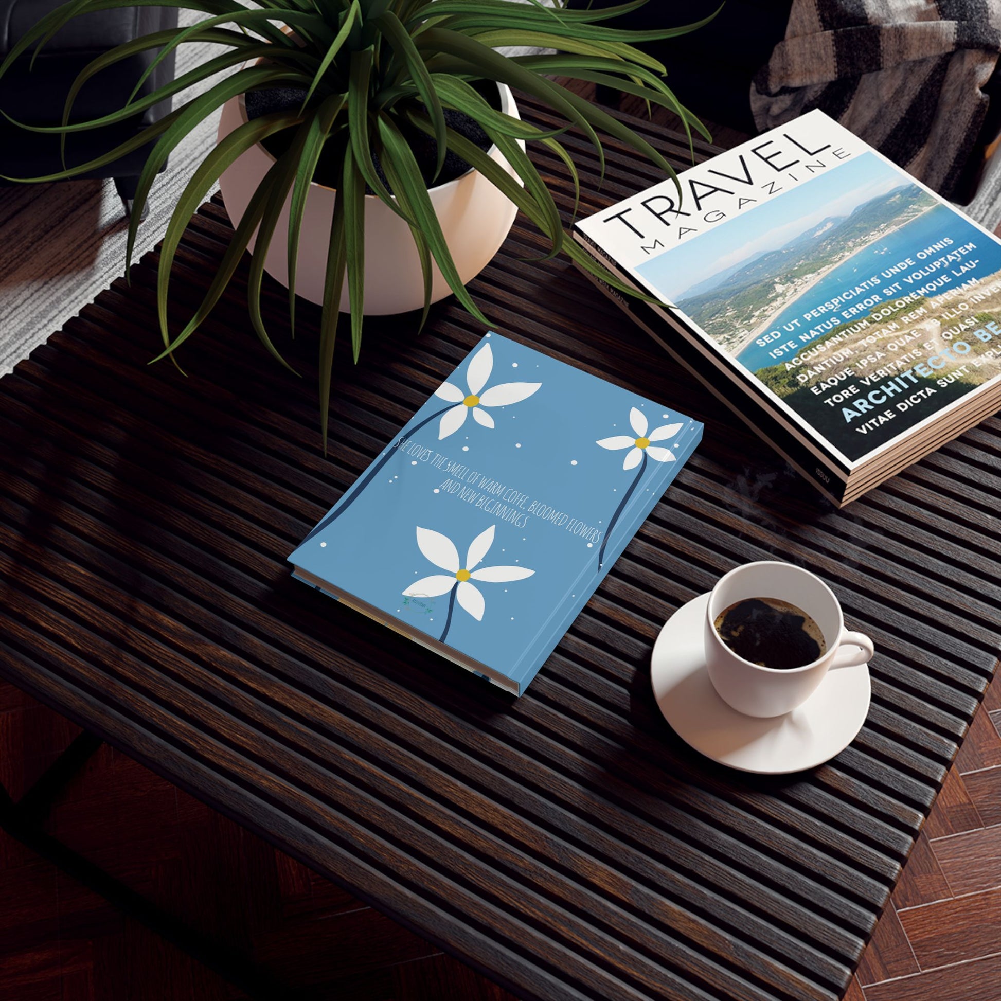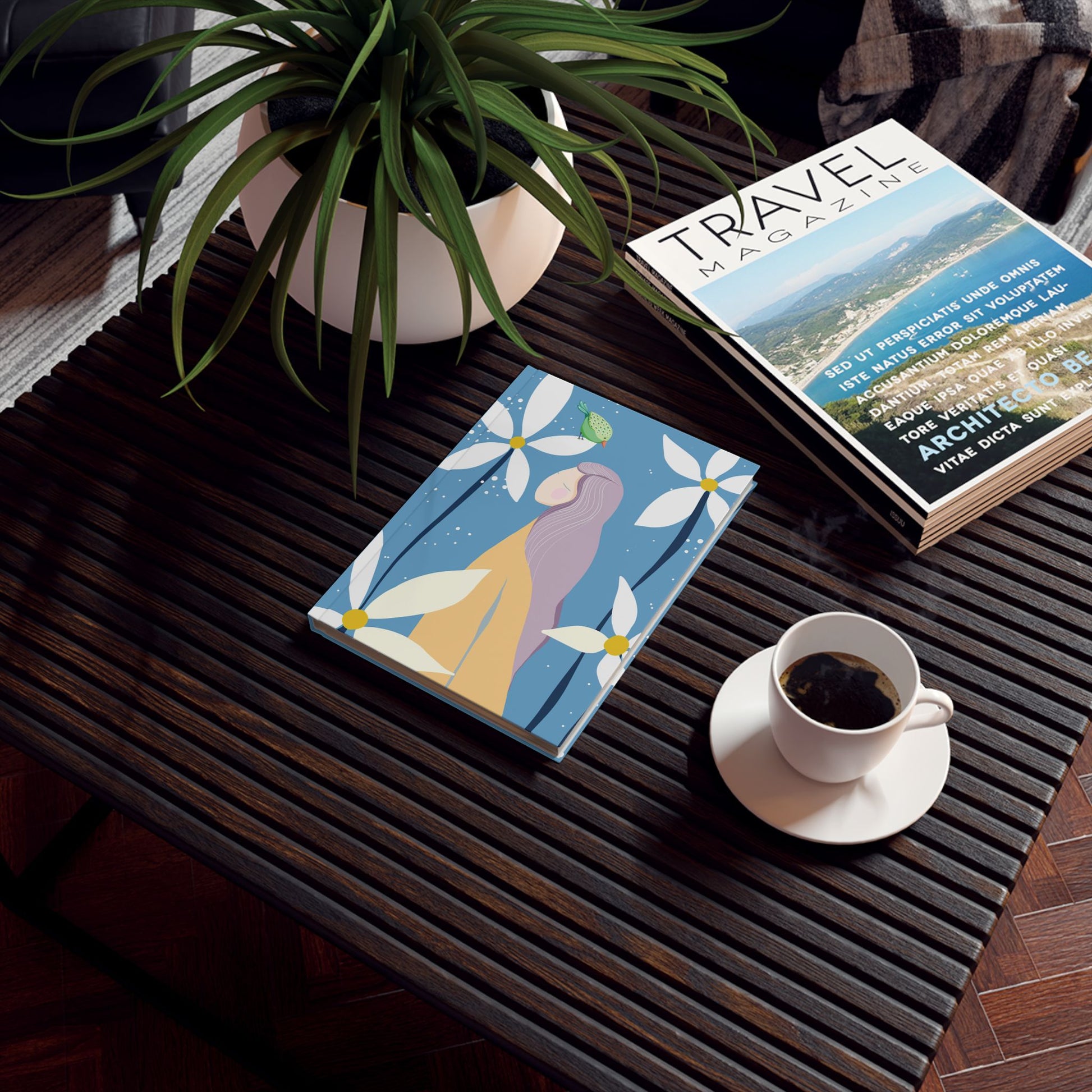 A soft, carry-anywhere journal wrapped in a calming floral illustration. The matte cover shows a quiet figure among oversized white flowers on a powder-blue field — a gentle scene that invites slow mornings, reflective lists, and unfolding ideas. The flexible casewrap binding lets the pages lie flat while you sketch or write. Inside, 128 pages of smooth 90 gsm paper are available in ruled, graph, or blank layouts so the book adapts to notes, drawings, or plans. Lightweight and durable, the full-wrap print keeps the artwork continuous around the cover so your thoughts stay framed by that same peaceful moment.