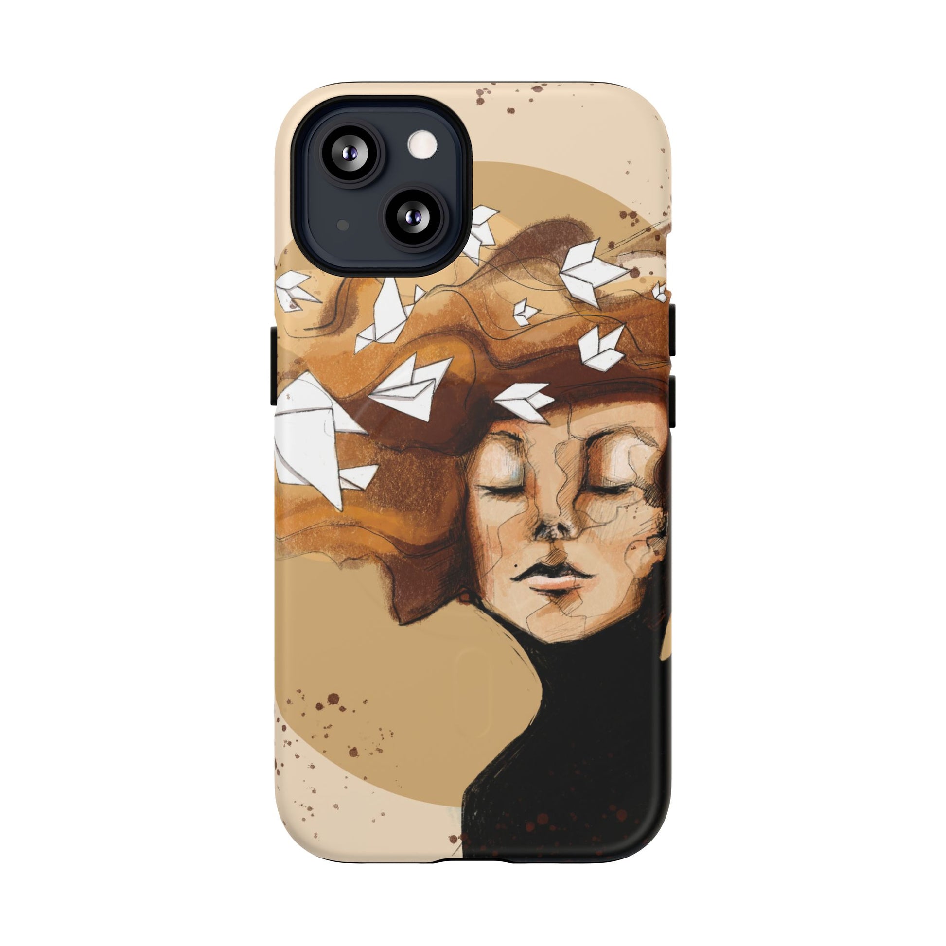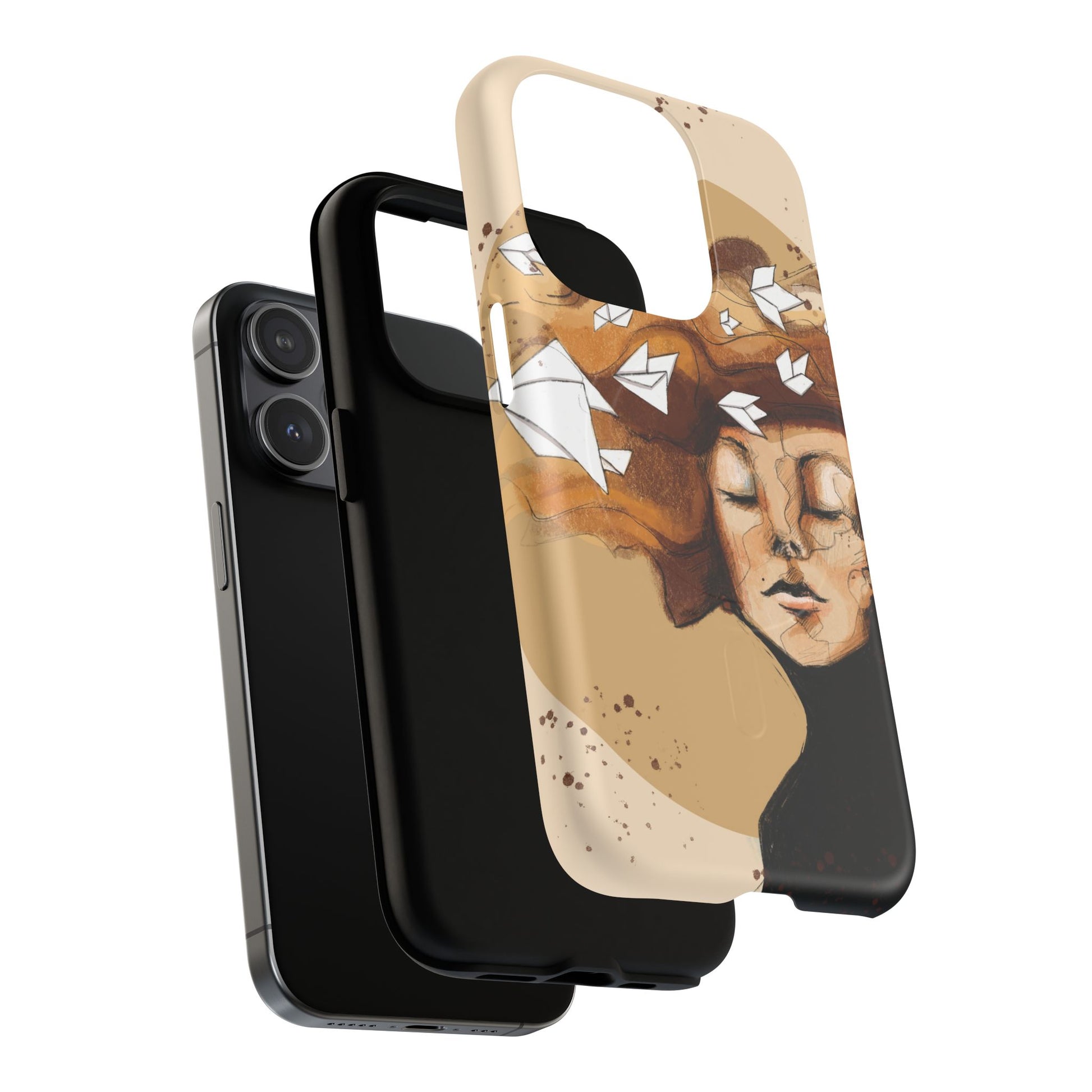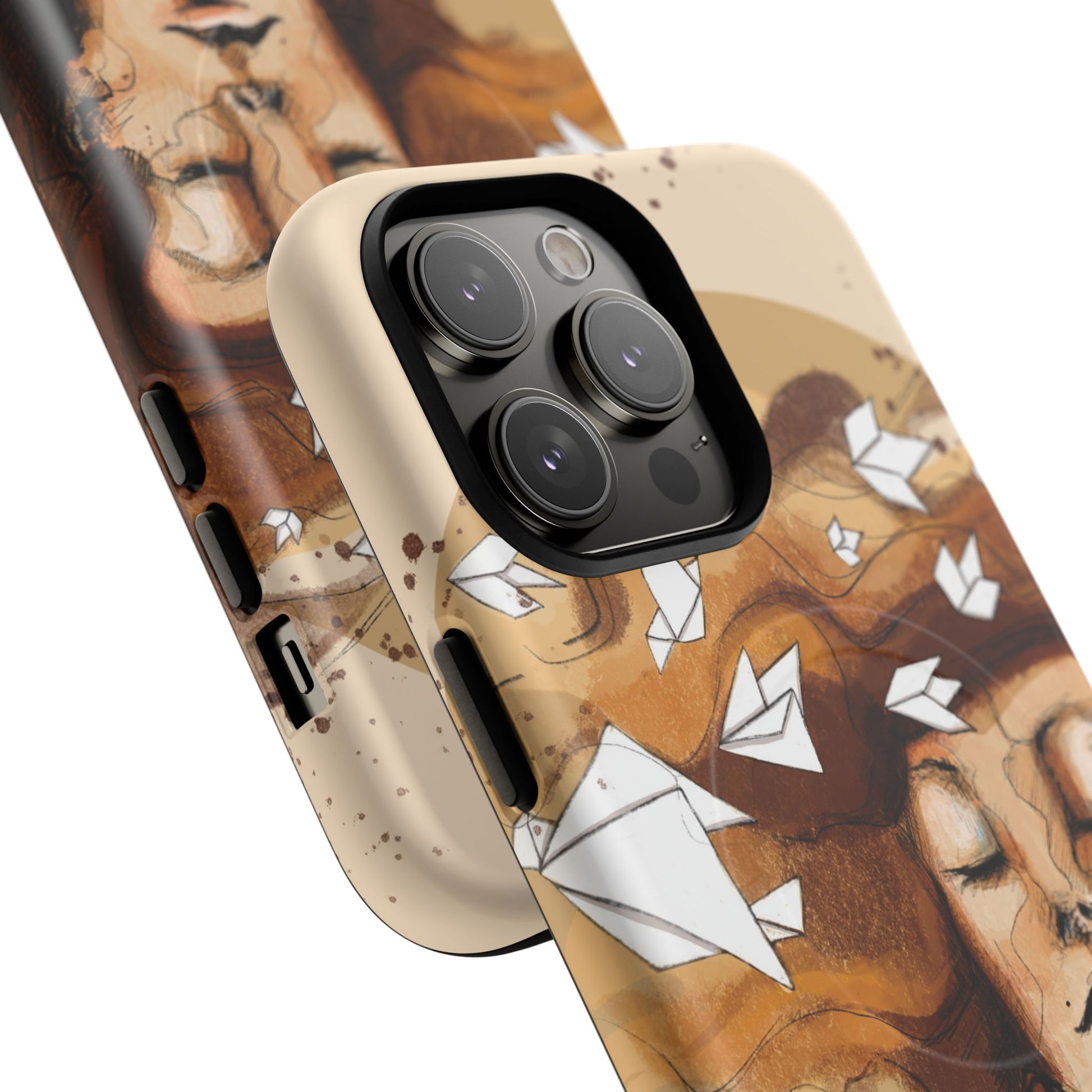 This slim, protective phone case carries a gentle, artful mood — a soft-faced figure with flowing auburn hair and a flurry of paper cranes drifting through a warm, sandy palette. The 3D wrap print keeps the illustration vivid across the sides, while the dual-layer construction and TPU silicone liner absorb shocks without hiding the artwork. It snaps on easily, leaves ports accessible, and works with MagSafe® accessories so functionality stays effortless. Wear the storytelling everywhere you go: commuting, coffee dates, or quiet moments when you want your phone to feel like a small piece of personal art.