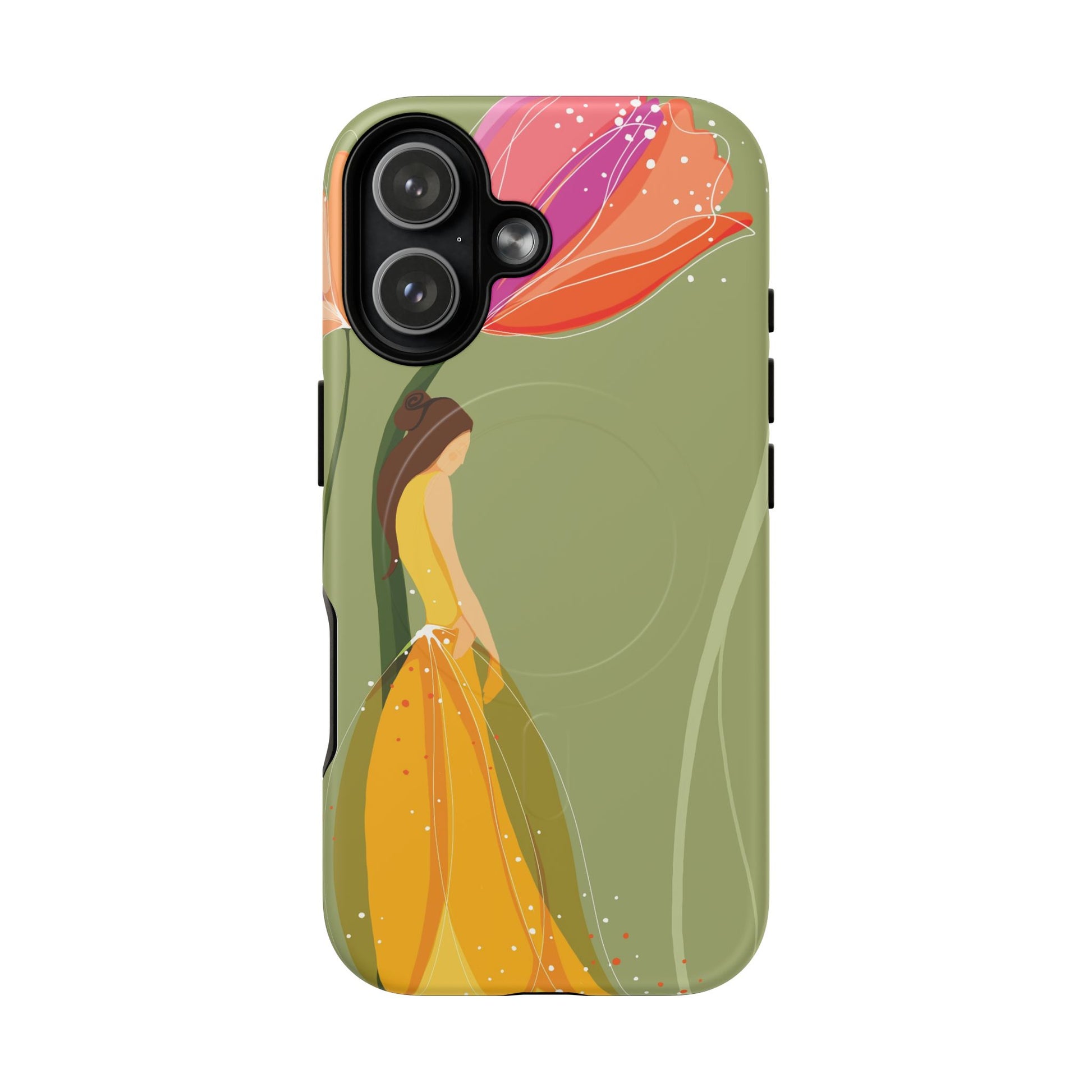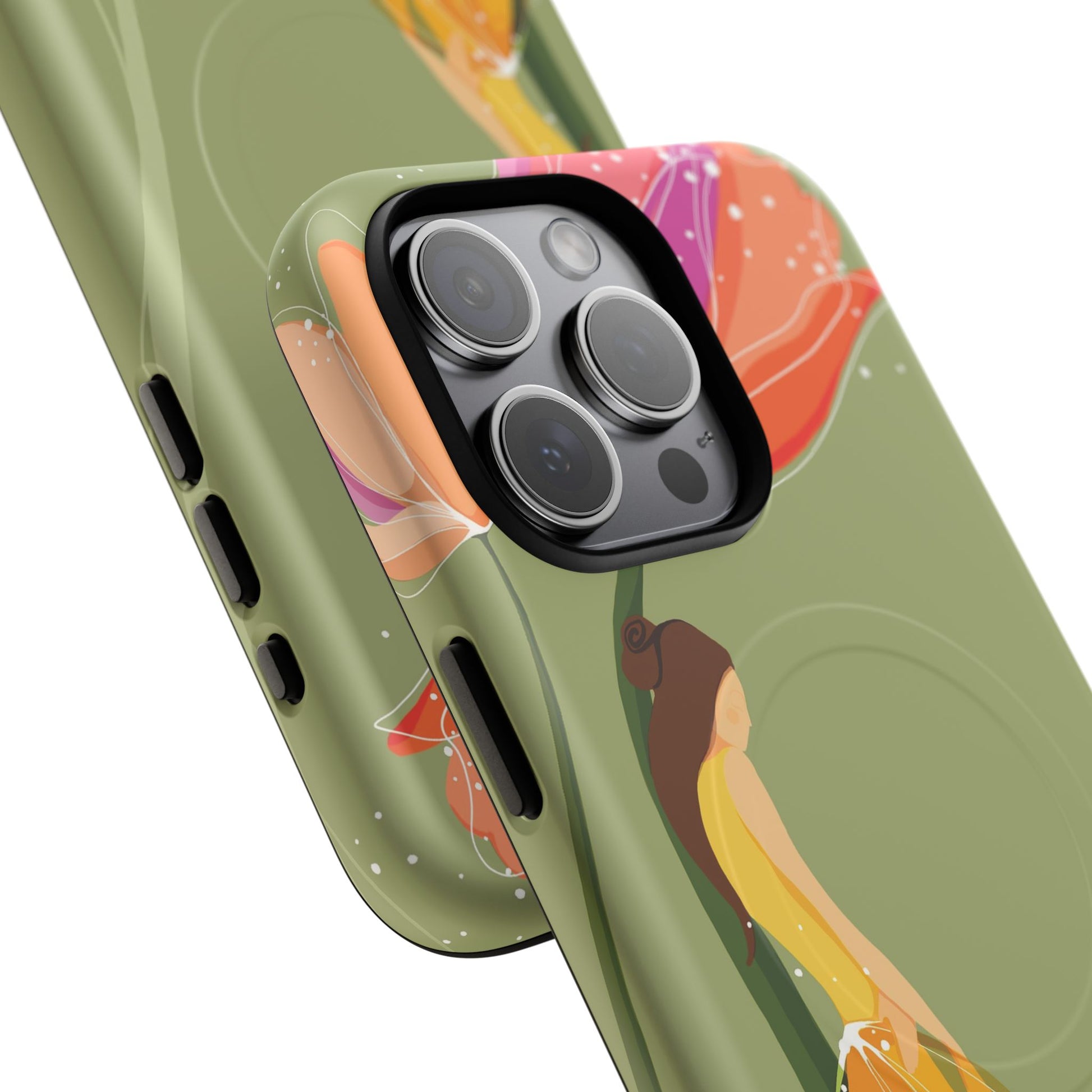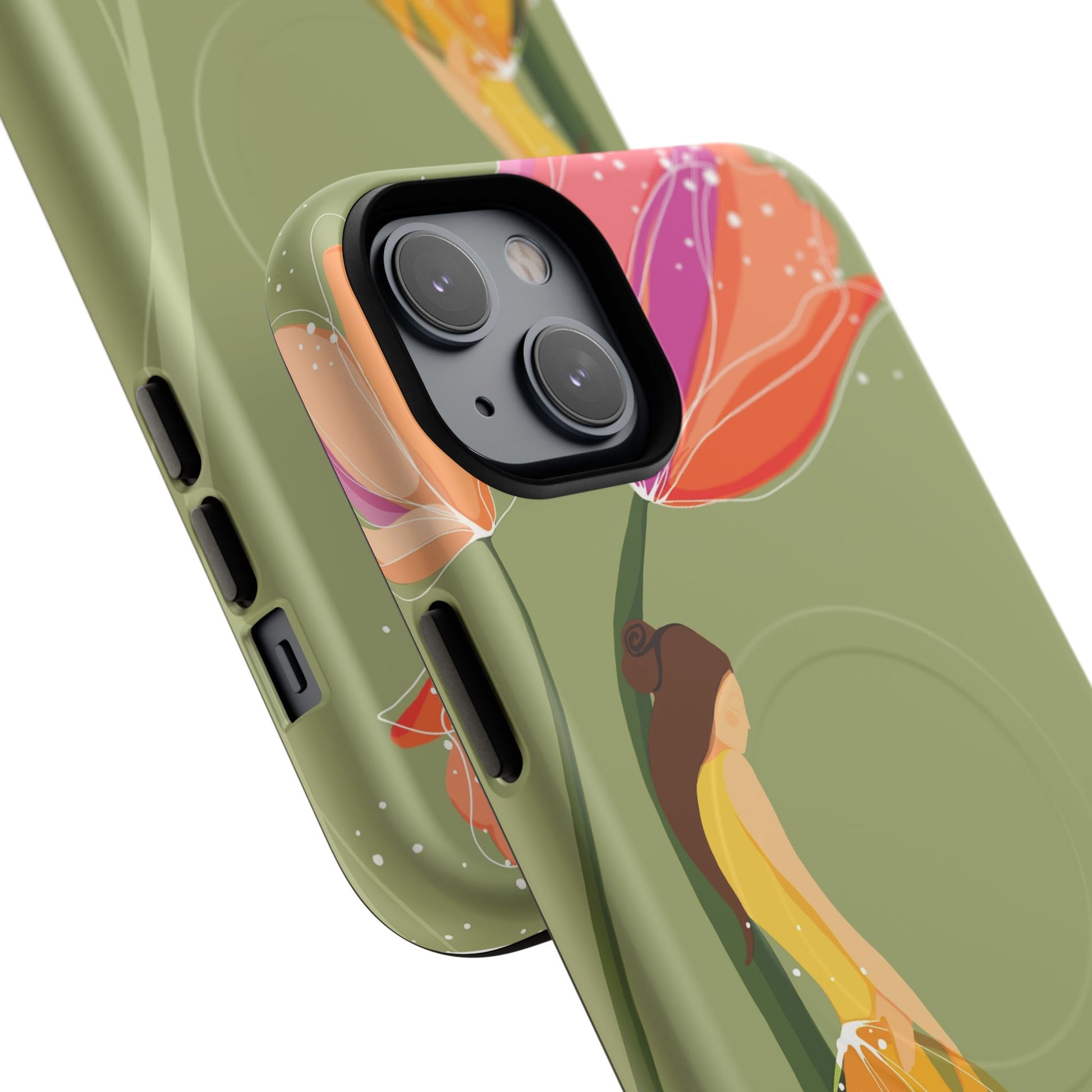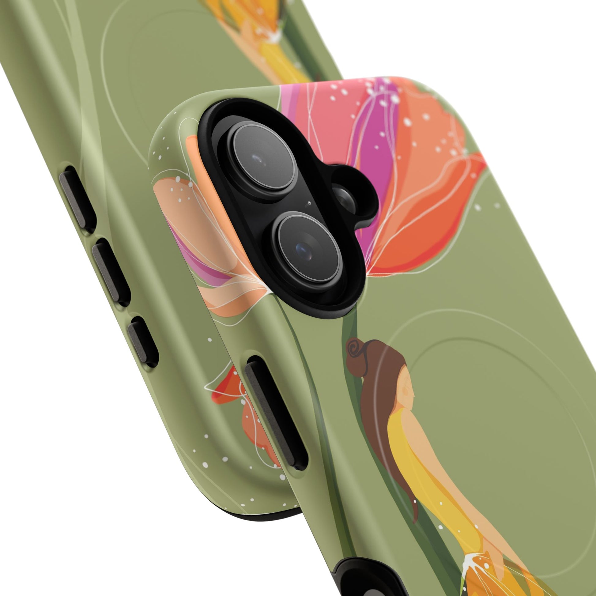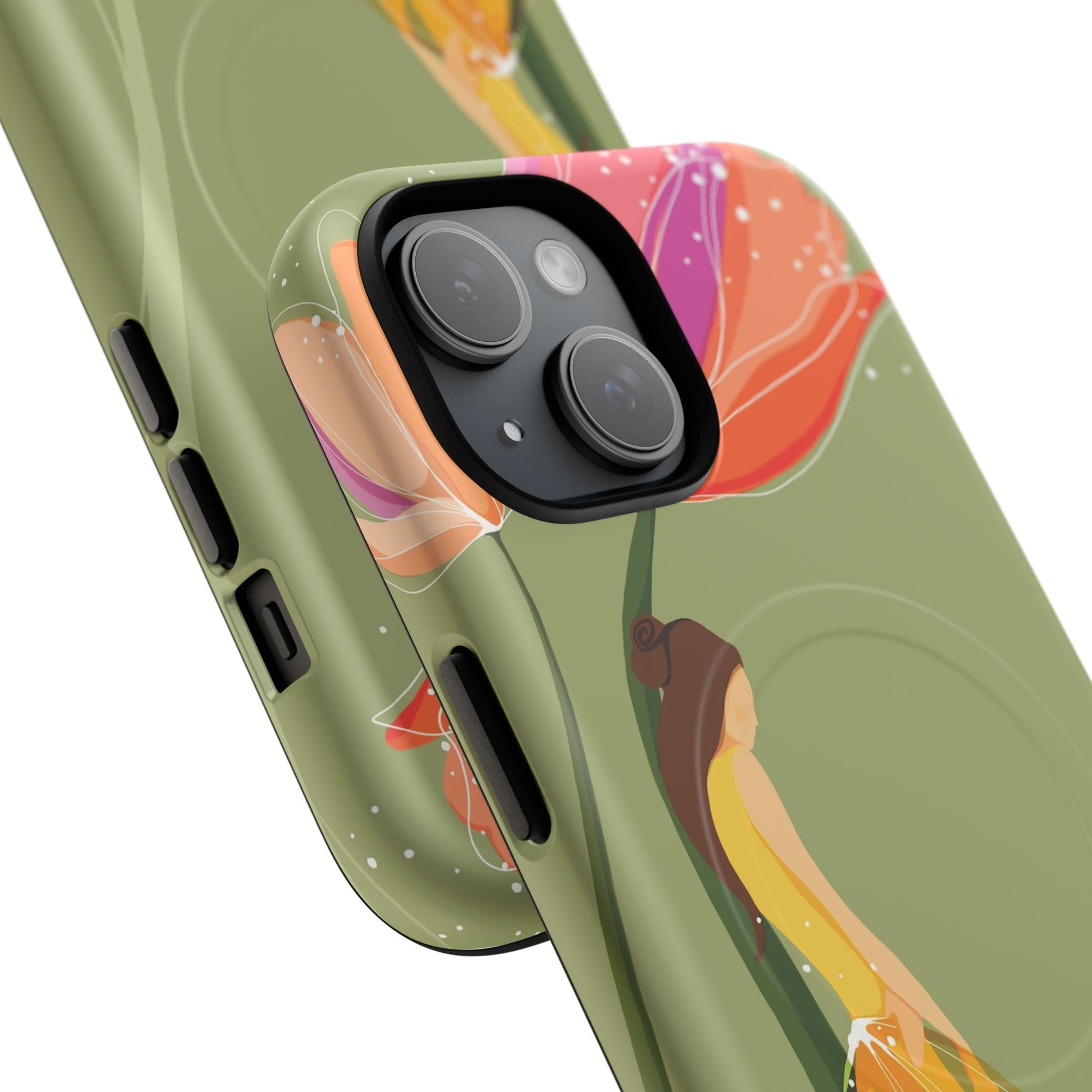 A slim, protective phone case that brings a quiet, painterly moment to your everyday carry. Soft olive-green tones cradle a stylized floral figure—petals unfolding like a long skirt—so your phone looks like a small moving piece of art. The dual-layer shell absorbs shocks while the glossy or matte printed surface keeps colors vivid. Subtle raised edges protect the camera and screen, and the MagSafe-compatible magnetic module snaps onto chargers and mounts with ease. This case lives comfortably between function and gentle beauty—carry it when you want your device to feel calm, considered, and a little whimsical.