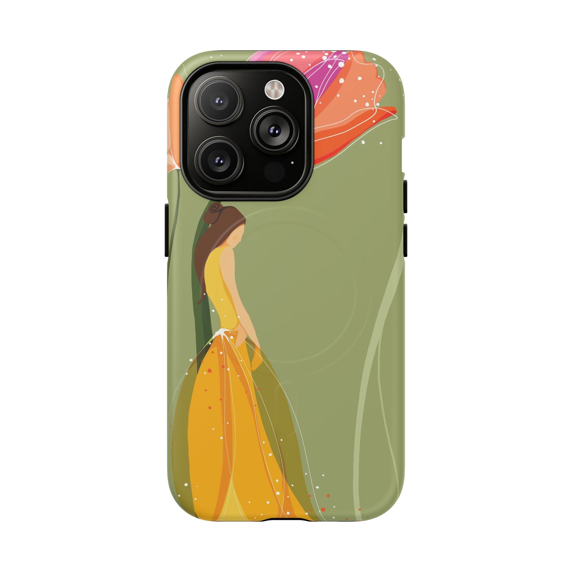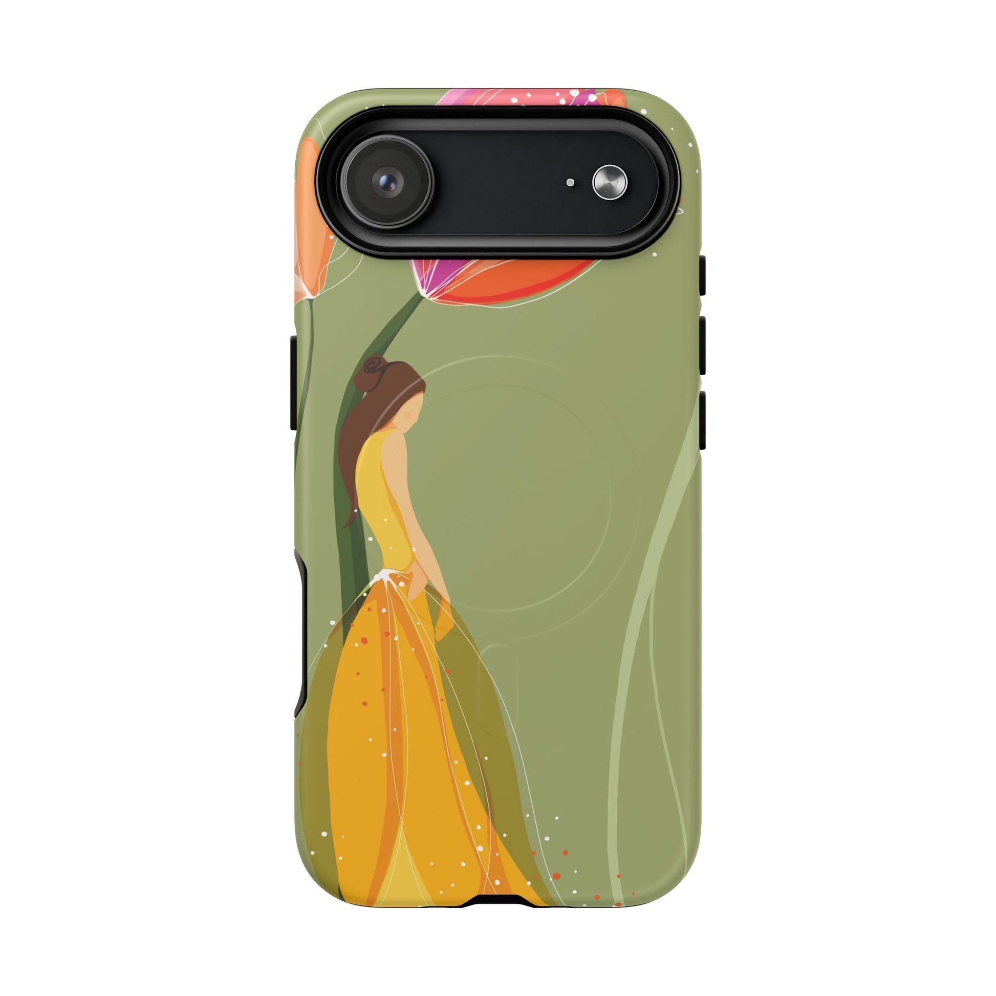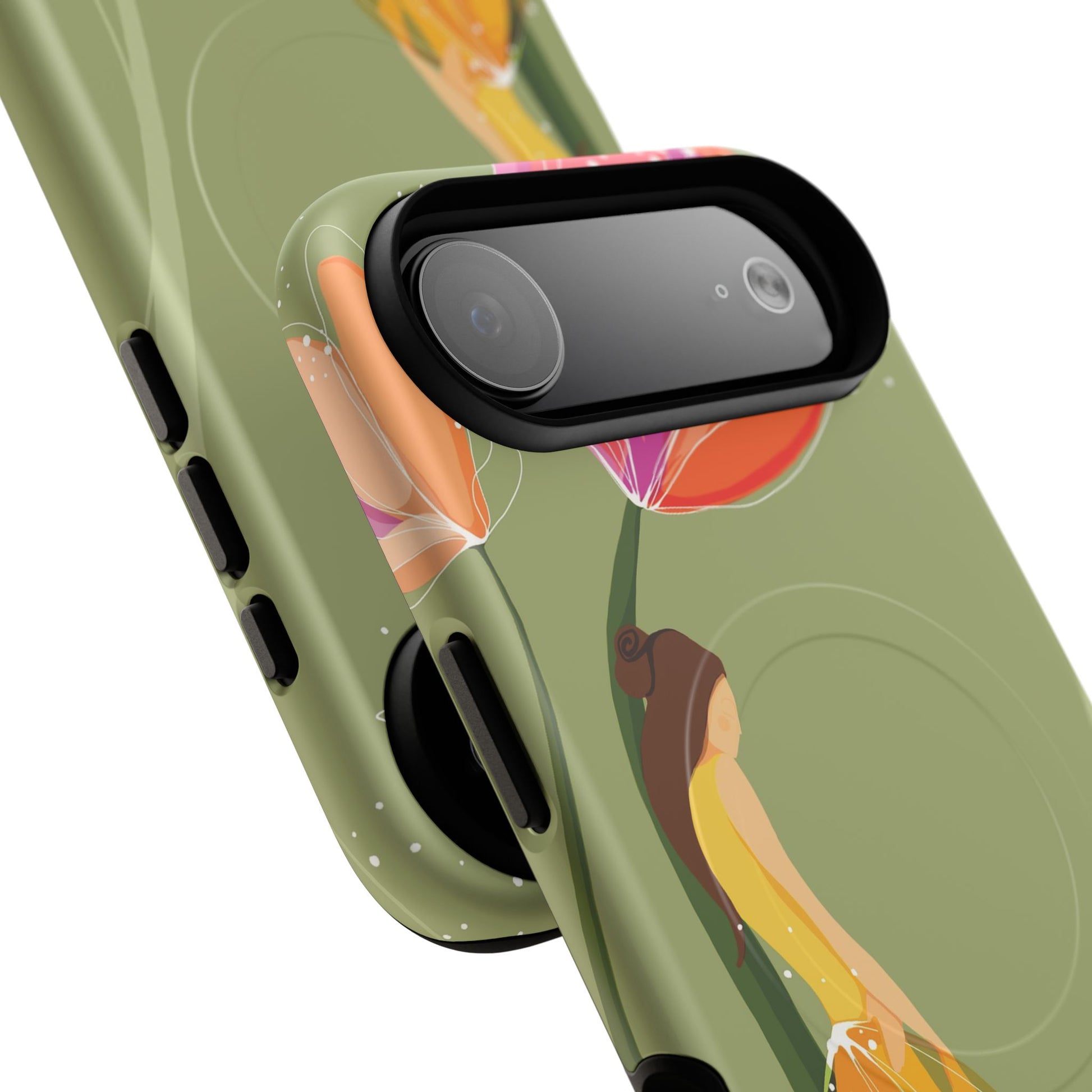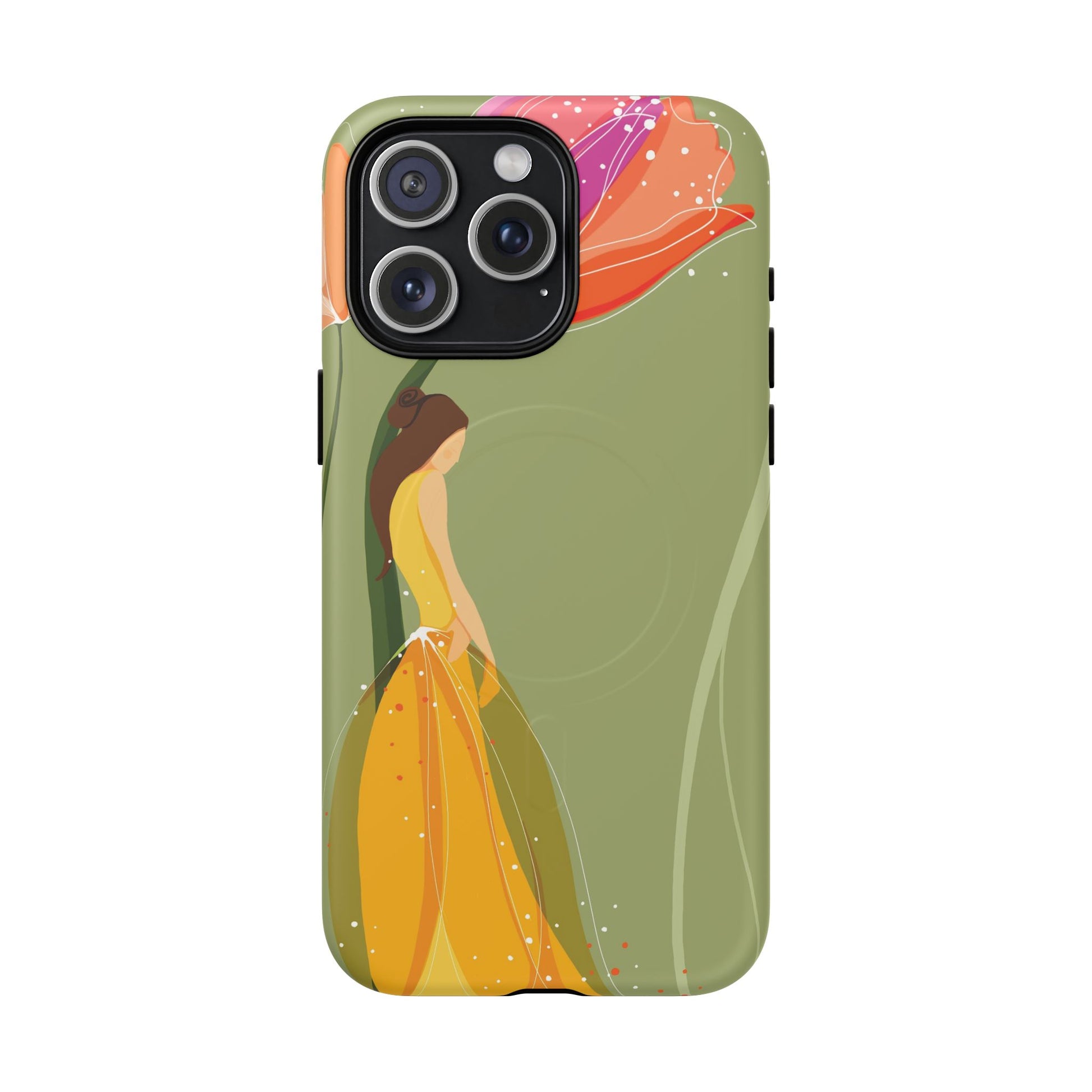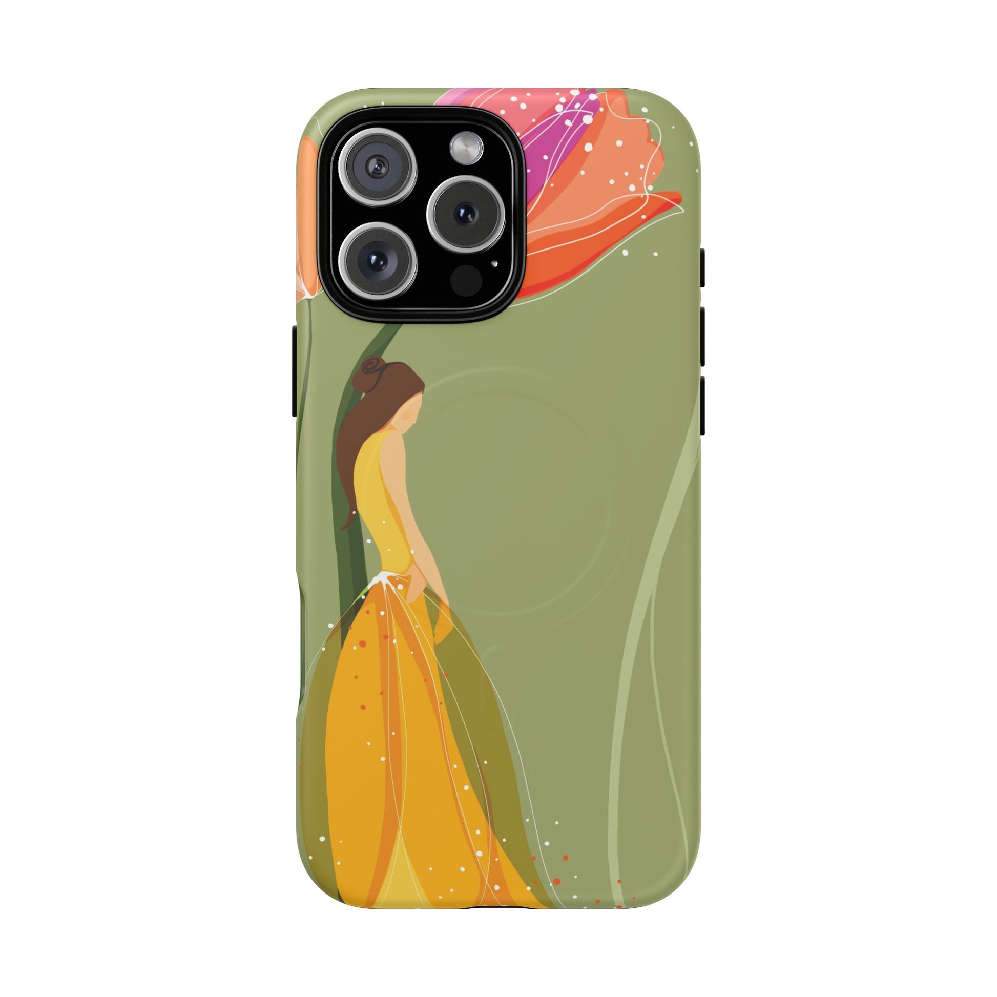 A slim, protective phone case that brings a quiet, painterly moment to your everyday carry. Soft olive-green tones cradle a stylized floral figure—petals unfolding like a long skirt—so your phone looks like a small moving piece of art. The dual-layer shell absorbs shocks while the glossy or matte printed surface keeps colors vivid. Subtle raised edges protect the camera and screen, and the MagSafe-compatible magnetic module snaps onto chargers and mounts with ease. This case lives comfortably between function and gentle beauty—carry it when you want your device to feel calm, considered, and a little whimsical.