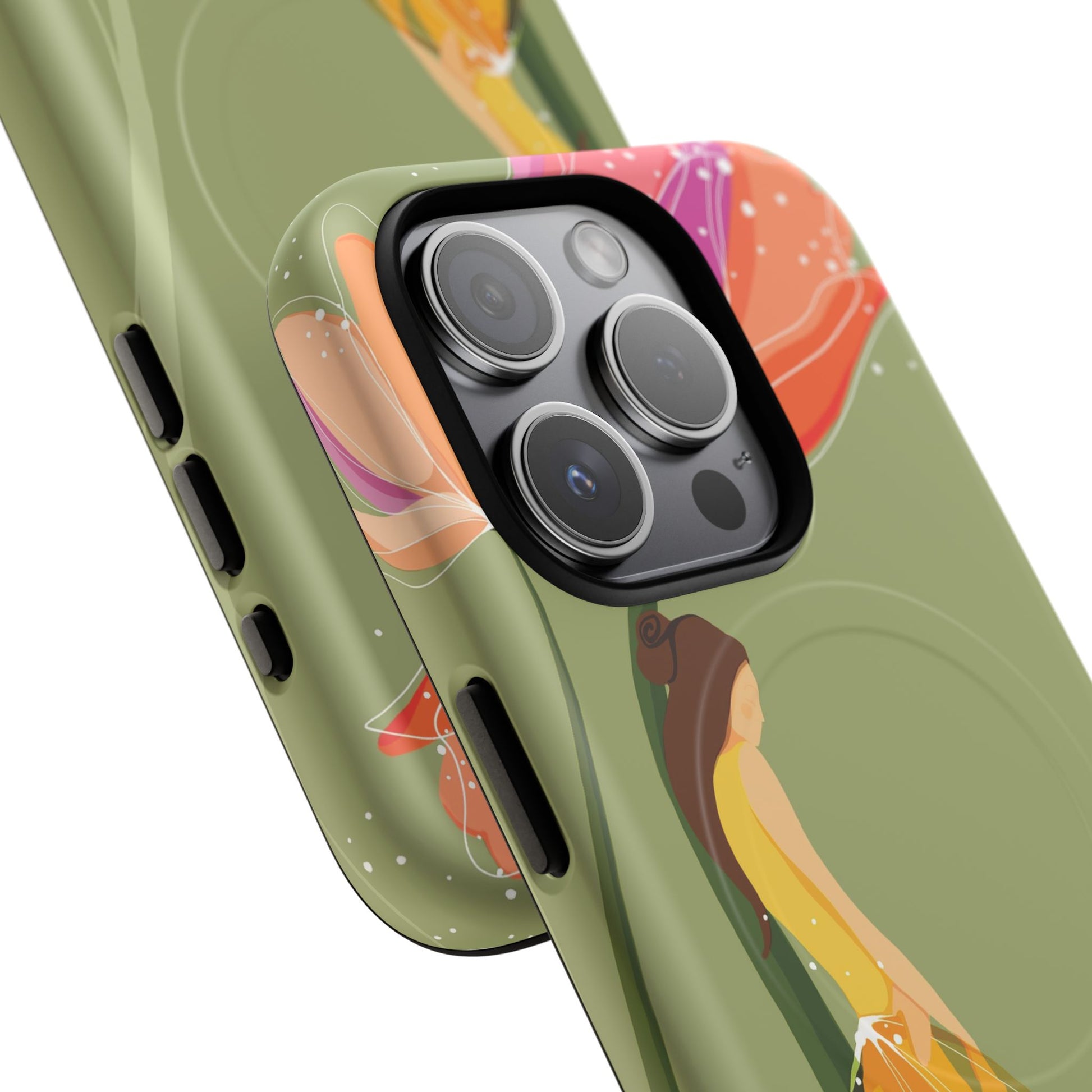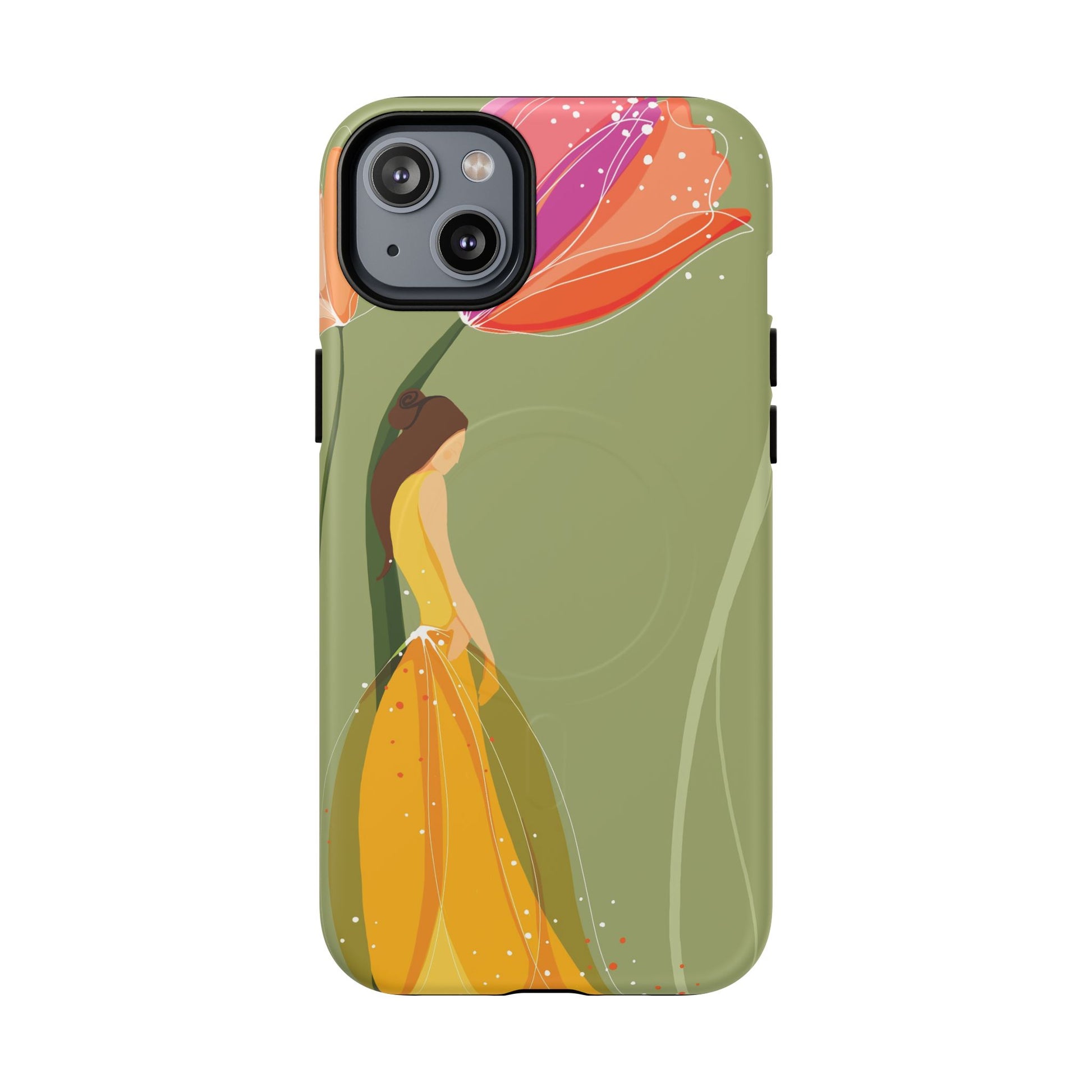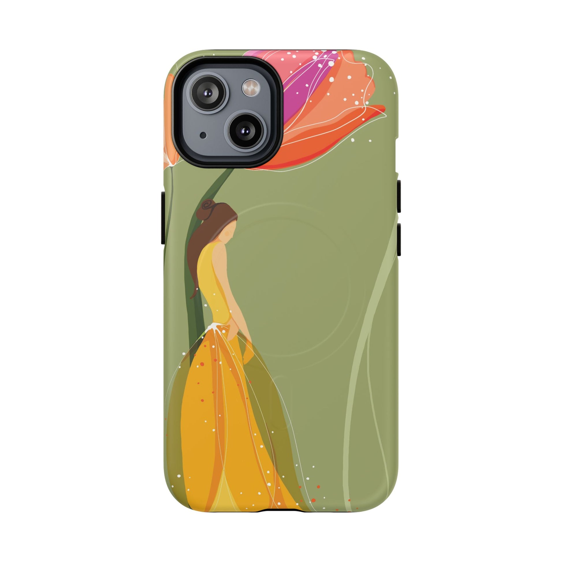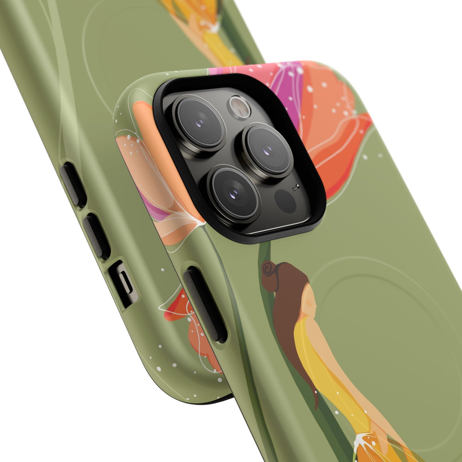 A slim, protective phone case that brings a quiet, painterly moment to your everyday carry. Soft olive-green tones cradle a stylized floral figure—petals unfolding like a long skirt—so your phone looks like a small moving piece of art. The dual-layer shell absorbs shocks while the glossy or matte printed surface keeps colors vivid. Subtle raised edges protect the camera and screen, and the MagSafe-compatible magnetic module snaps onto chargers and mounts with ease. This case lives comfortably between function and gentle beauty—carry it when you want your device to feel calm, considered, and a little whimsical.