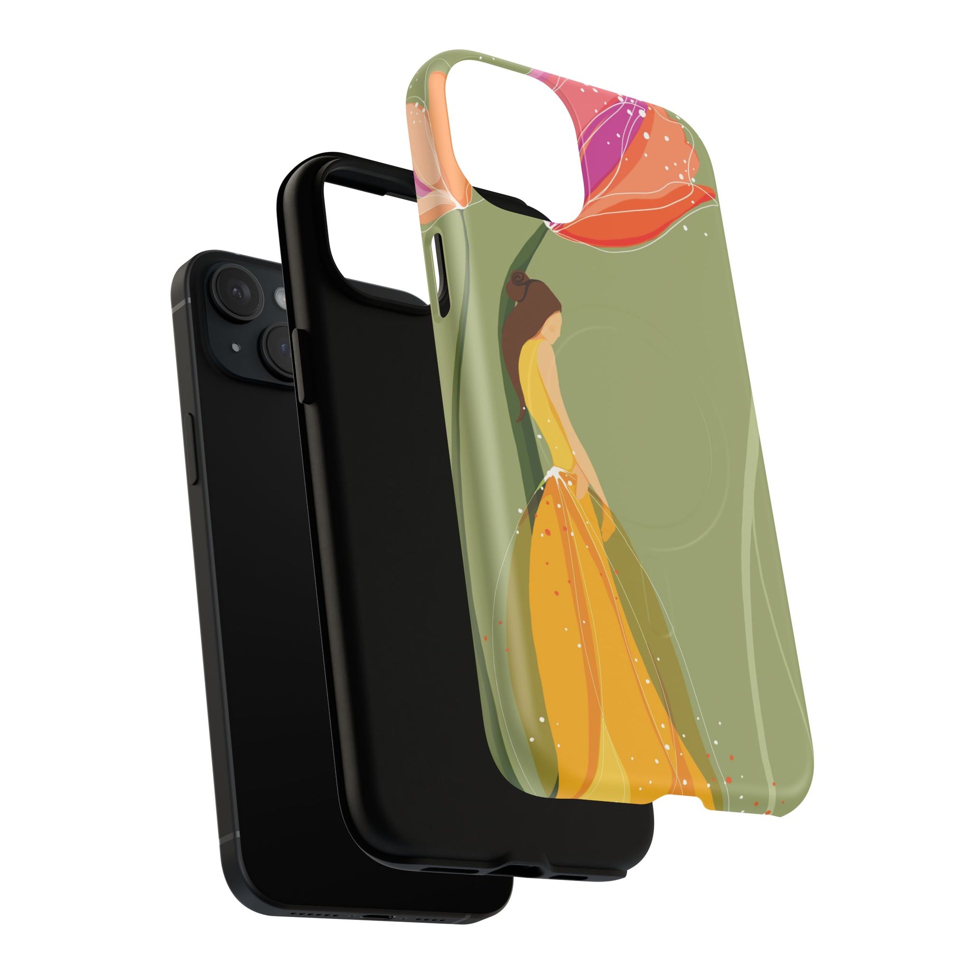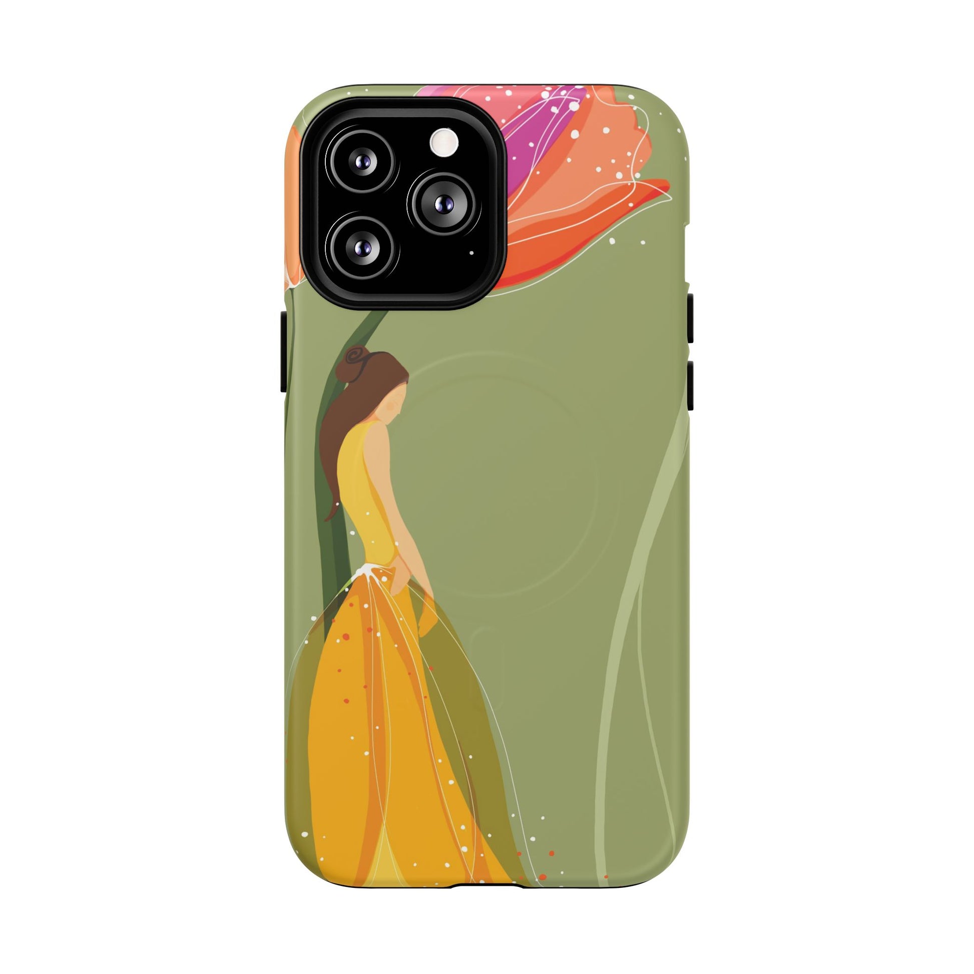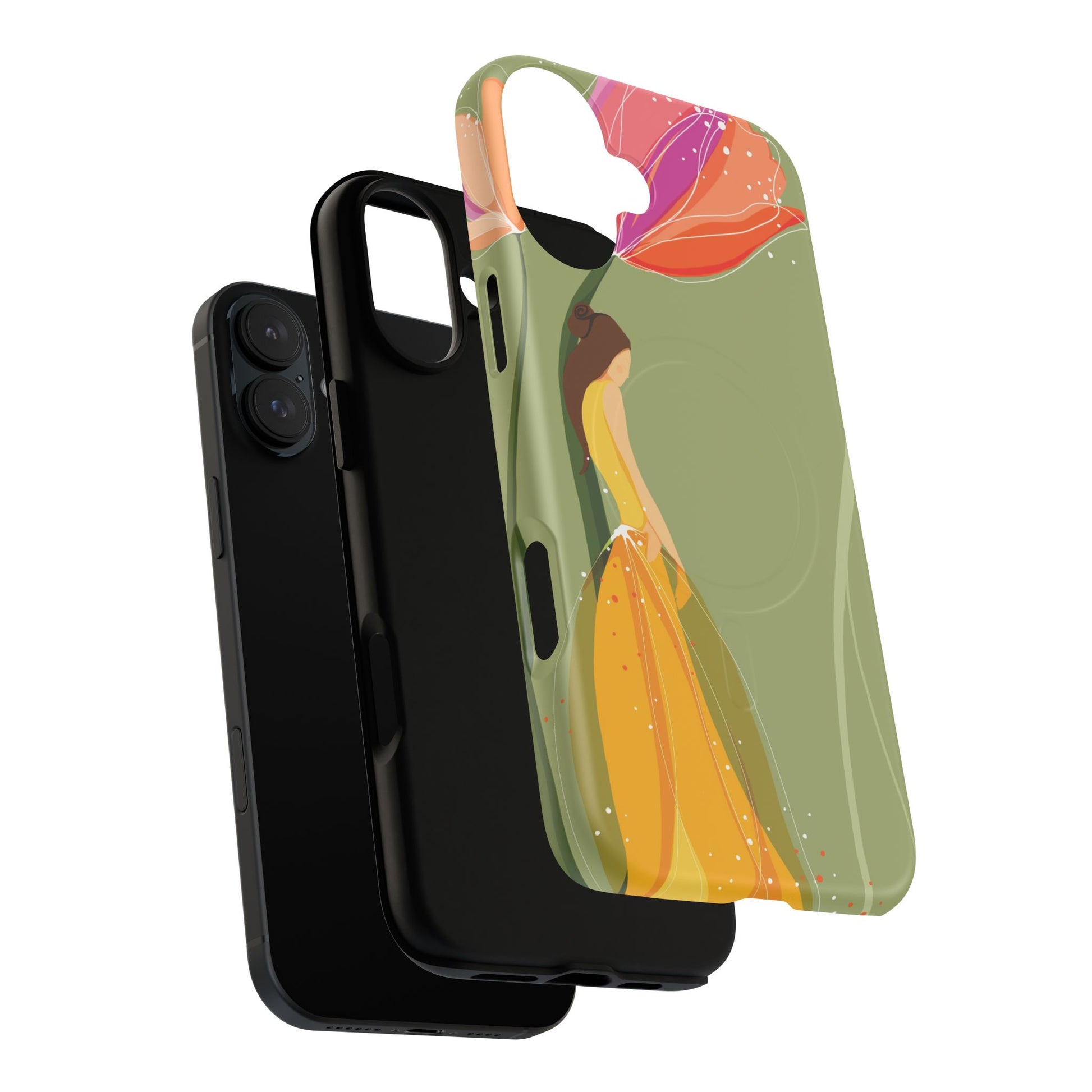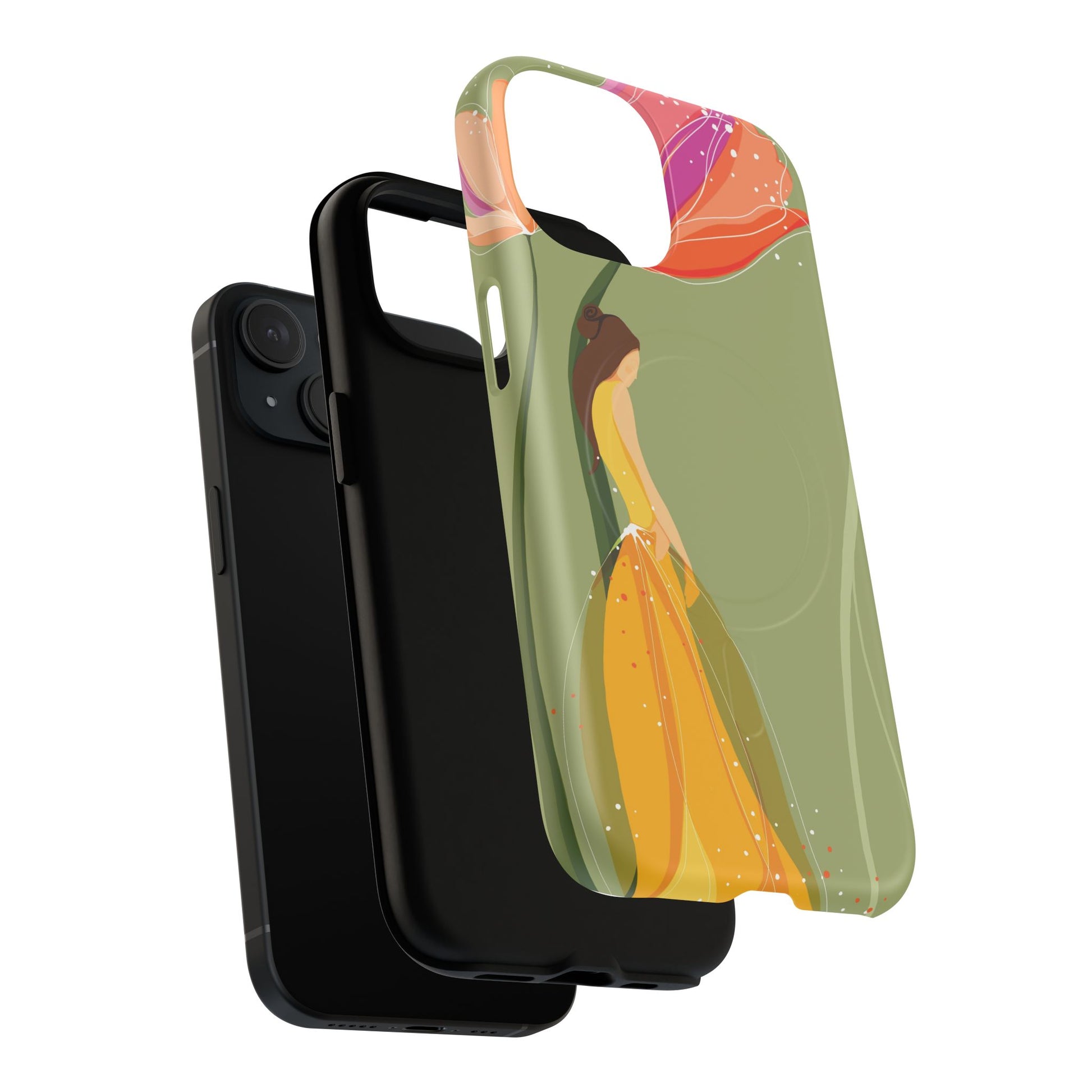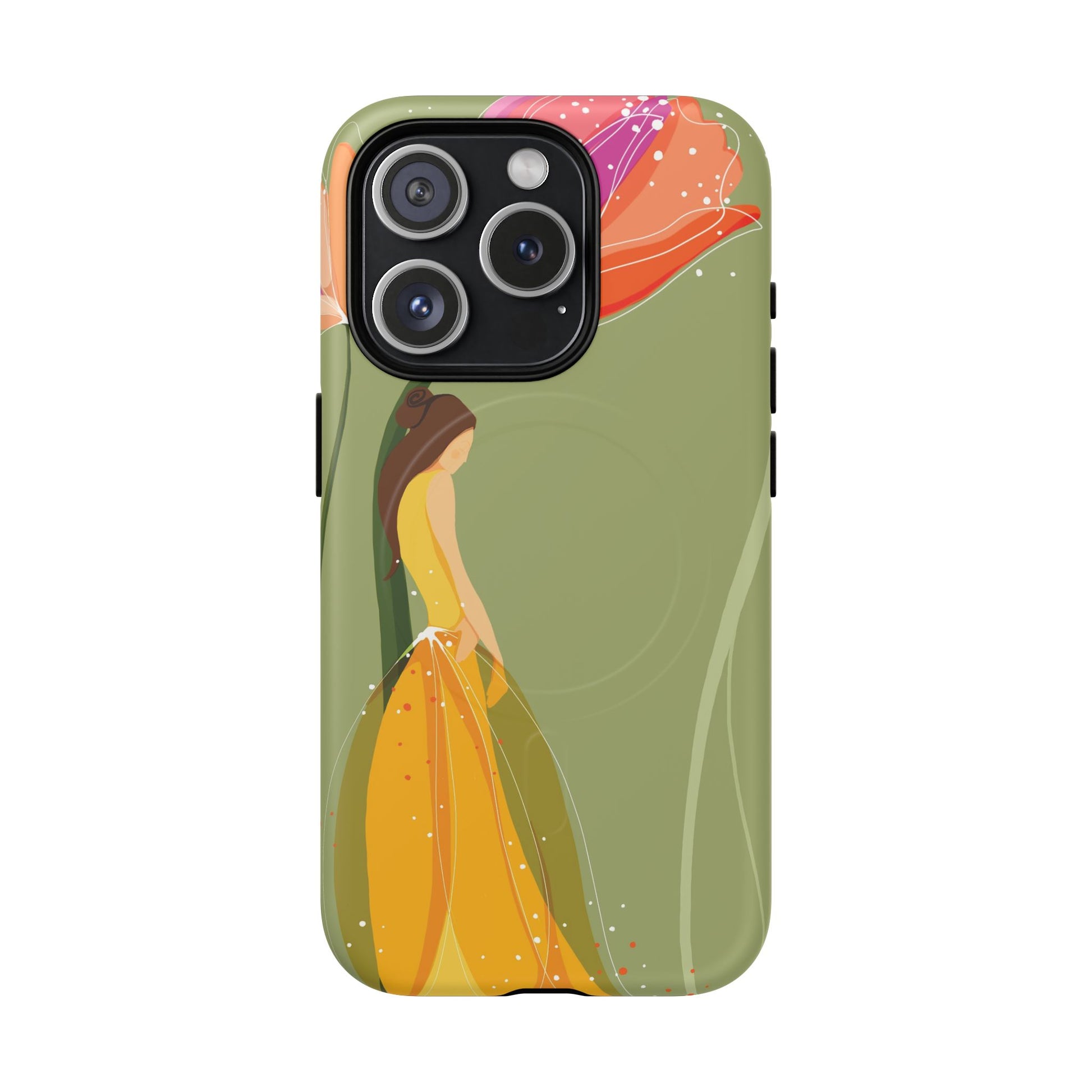 A slim, protective phone case that brings a quiet, painterly moment to your everyday carry. Soft olive-green tones cradle a stylized floral figure—petals unfolding like a long skirt—so your phone looks like a small moving piece of art. The dual-layer shell absorbs shocks while the glossy or matte printed surface keeps colors vivid. Subtle raised edges protect the camera and screen, and the MagSafe-compatible magnetic module snaps onto chargers and mounts with ease. This case lives comfortably between function and gentle beauty—carry it when you want your device to feel calm, considered, and a little whimsical.