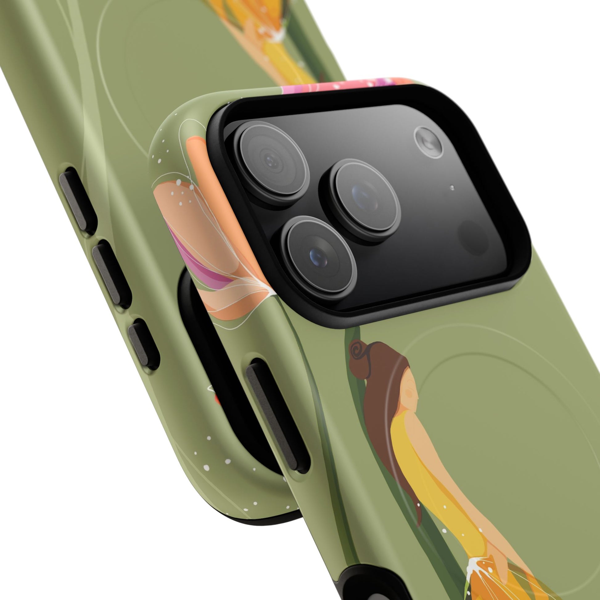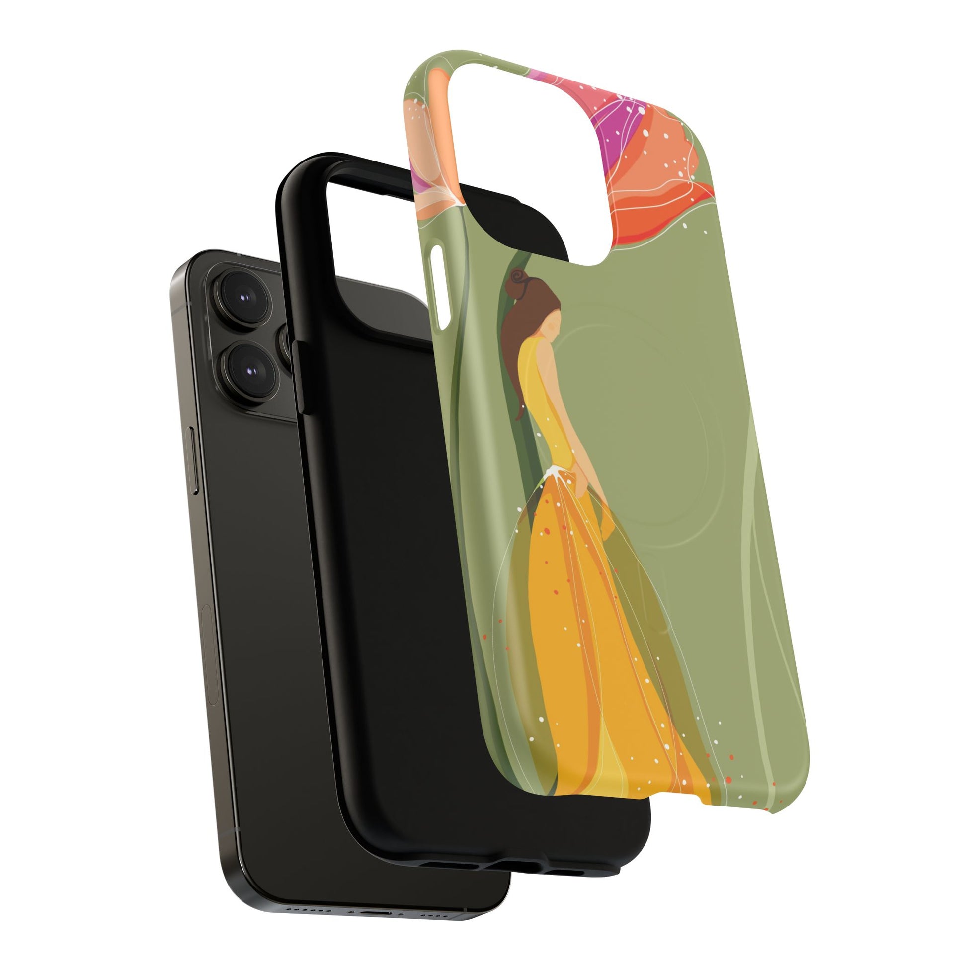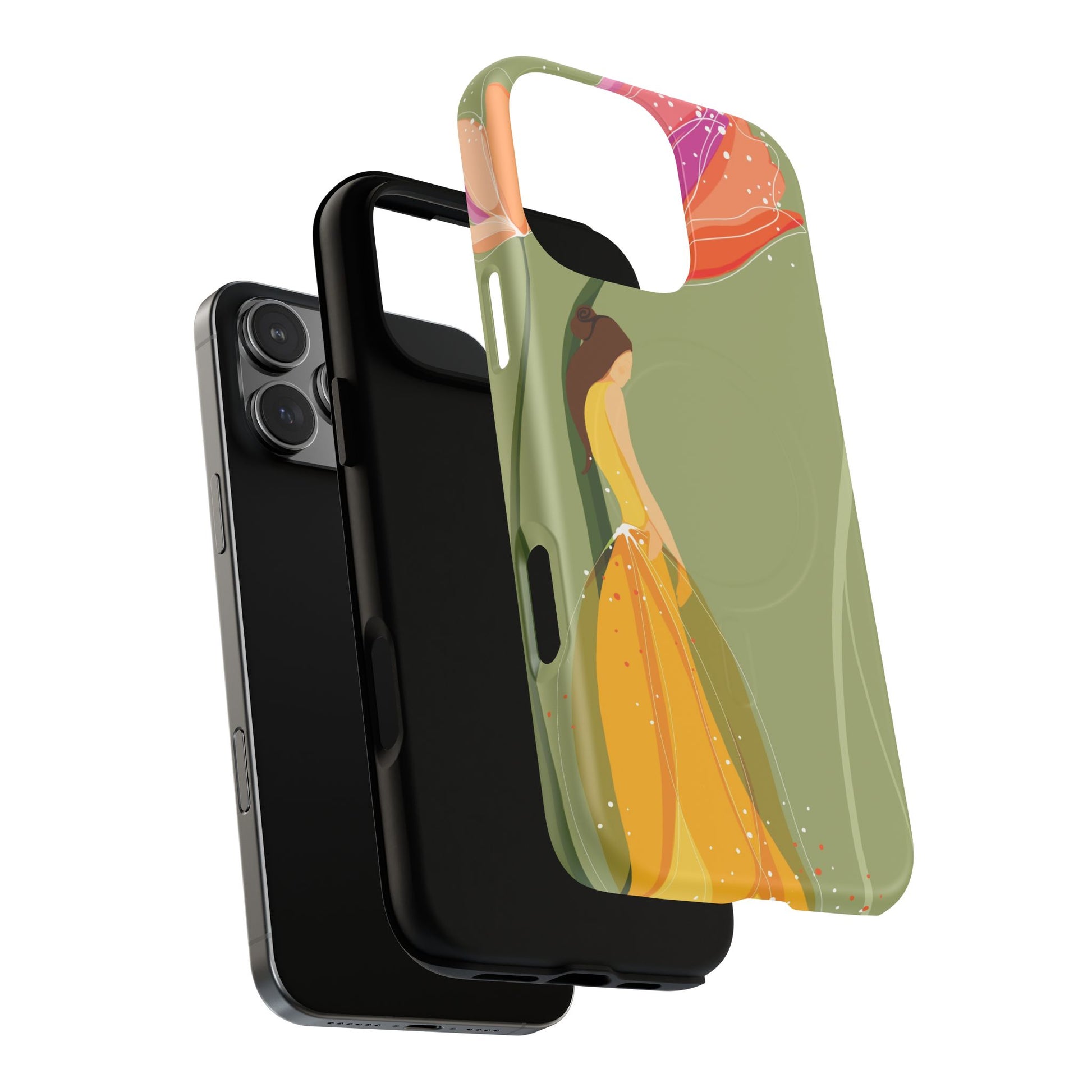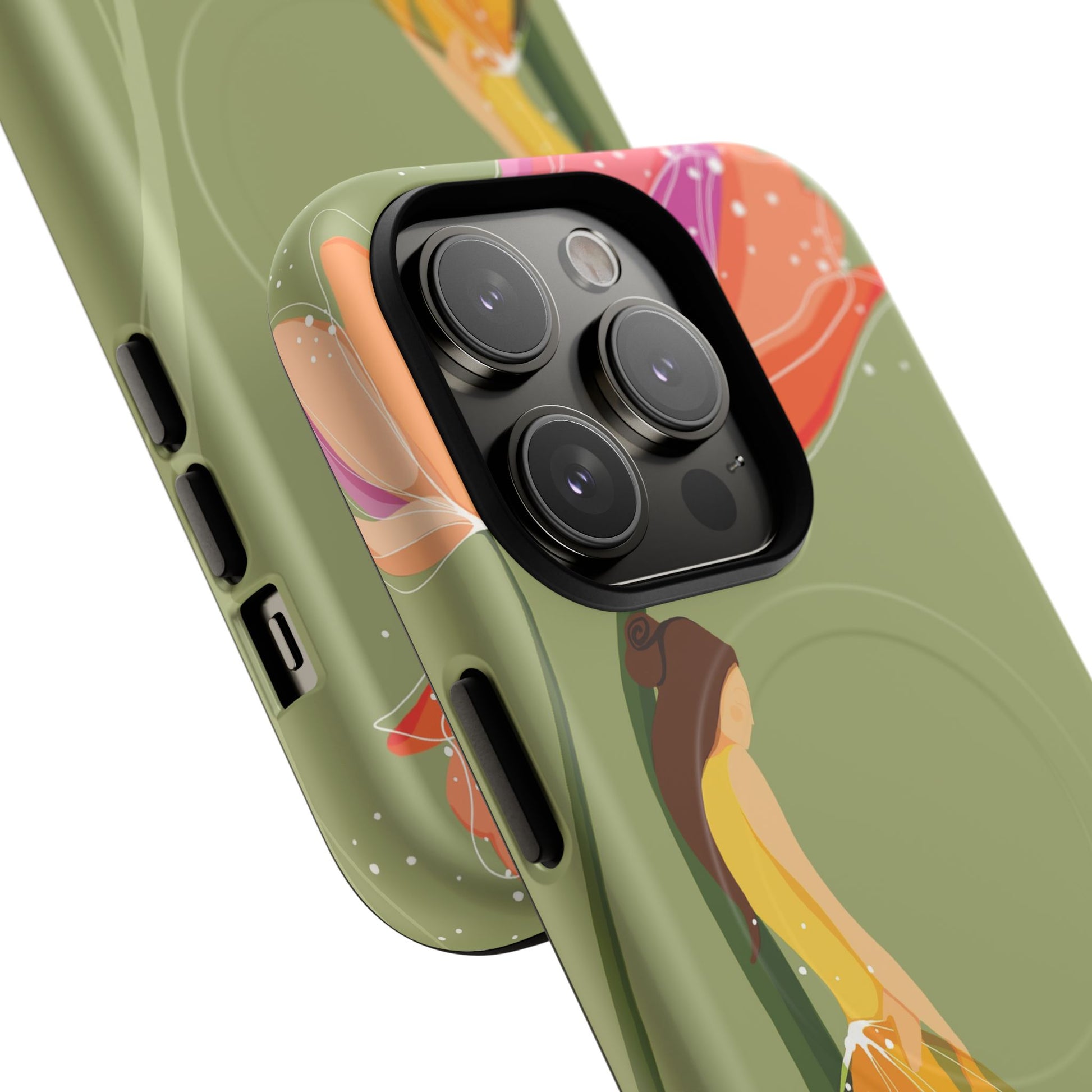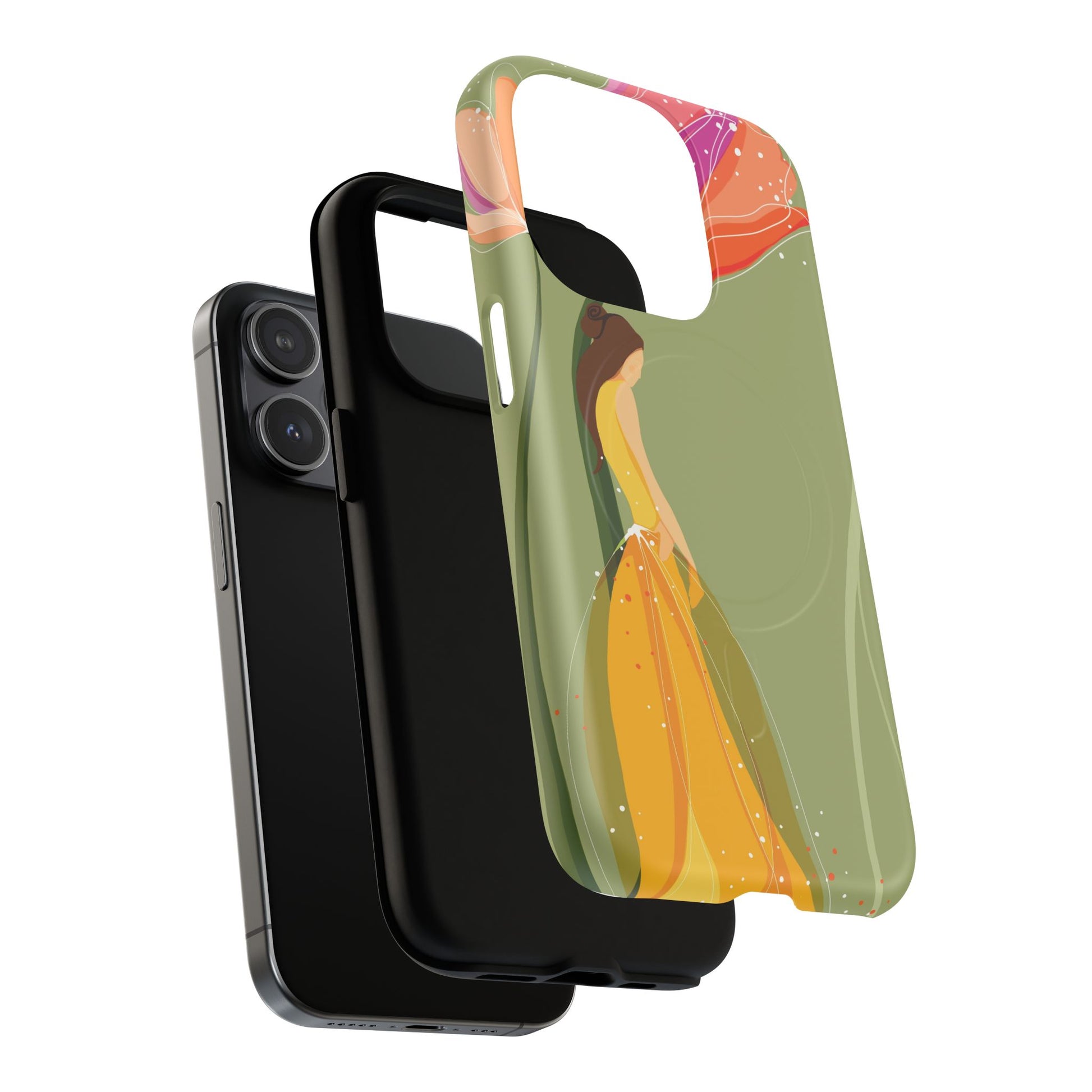 A slim, protective phone case that brings a quiet, painterly moment to your everyday carry. Soft olive-green tones cradle a stylized floral figure—petals unfolding like a long skirt—so your phone looks like a small moving piece of art. The dual-layer shell absorbs shocks while the glossy or matte printed surface keeps colors vivid. Subtle raised edges protect the camera and screen, and the MagSafe-compatible magnetic module snaps onto chargers and mounts with ease. This case lives comfortably between function and gentle beauty—carry it when you want your device to feel calm, considered, and a little whimsical.